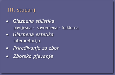 Težište nastavnog programa III. stupnja leži na poduci cjelovitosti shvaćanja, tumačenja i izvođenja glazbenoga djela u spoju sa znanjem i glasovnim umijećem stjećenim na prva dva stupnja.